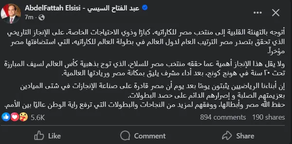 وتابع الرئيس السيسي عبر صفحته الرسمية على موقع التواصل الاجتماعي فيبسبوك: «ولا يقل هذا الإنجاز أهمية عما حققه منتخب مصر للسلاح، الذي توج بذهبية كأس العالم لسيف المبارزة تحت ٢٠ سنة في هونج كونج، بعد أداء مشرف يليق بمكانة مصر وريادتها العالمية.