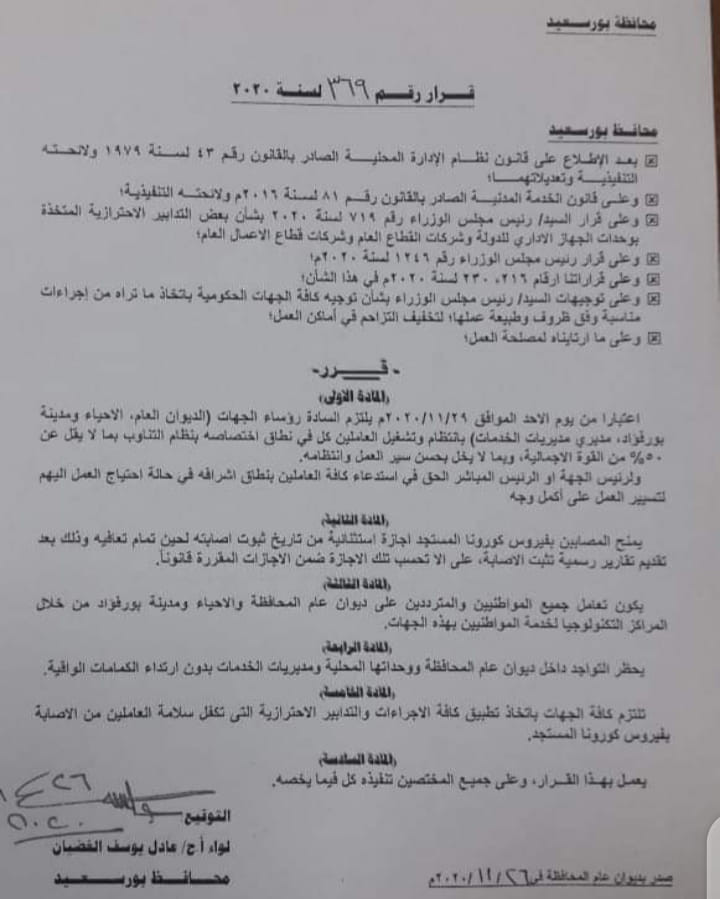 وشدد محافظ بورسعيد في قراره على أن يكون تعامل جميع الموظفين والمترددين على الديوان العام والأحياء ومدينة بورفؤاد من خلال المراكز التكنولوجية لخدمة المواطنين بهذه الجهات، مع حظر التواجد دون ارتداء الكمامات الواقية.