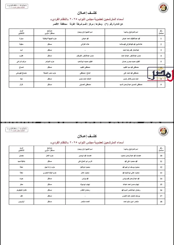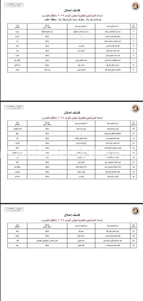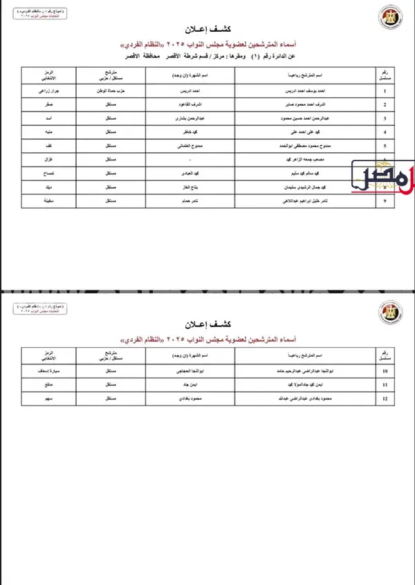اعلنت اللجنة المشرفة على انتخابات مجلس النواب بمحافظة الأقصر، الكشوف المبدئية بأسماء المرشحين الذين تم قبول أوراق ترشحهم لخوض السباق البرلماني 2025، وذلك عقب انتهاء لجان فحص الأوراق من مراجعة المستندات المقدمة من المرشحين في الدوائر الانتخابية الـ 3 على مستوى المحافظة.