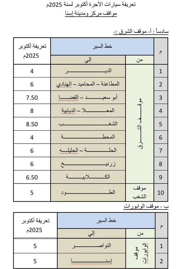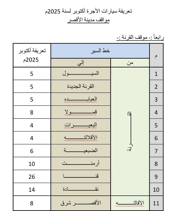 ووجهت اللجنة بسرعة شراء وطباعة الملصقات الخاصة بالتعريفة الجديدة، ليتم وضعها على السيارات وإعلانها للمواطنين بشكل واضح في جميع المواقف لضمان الالتزام بالأسعار المحددة، وفيما يلى بيان بالتسعيرة الجديدة لكافة الخطوط والمواقف من وإلى الأقصر.