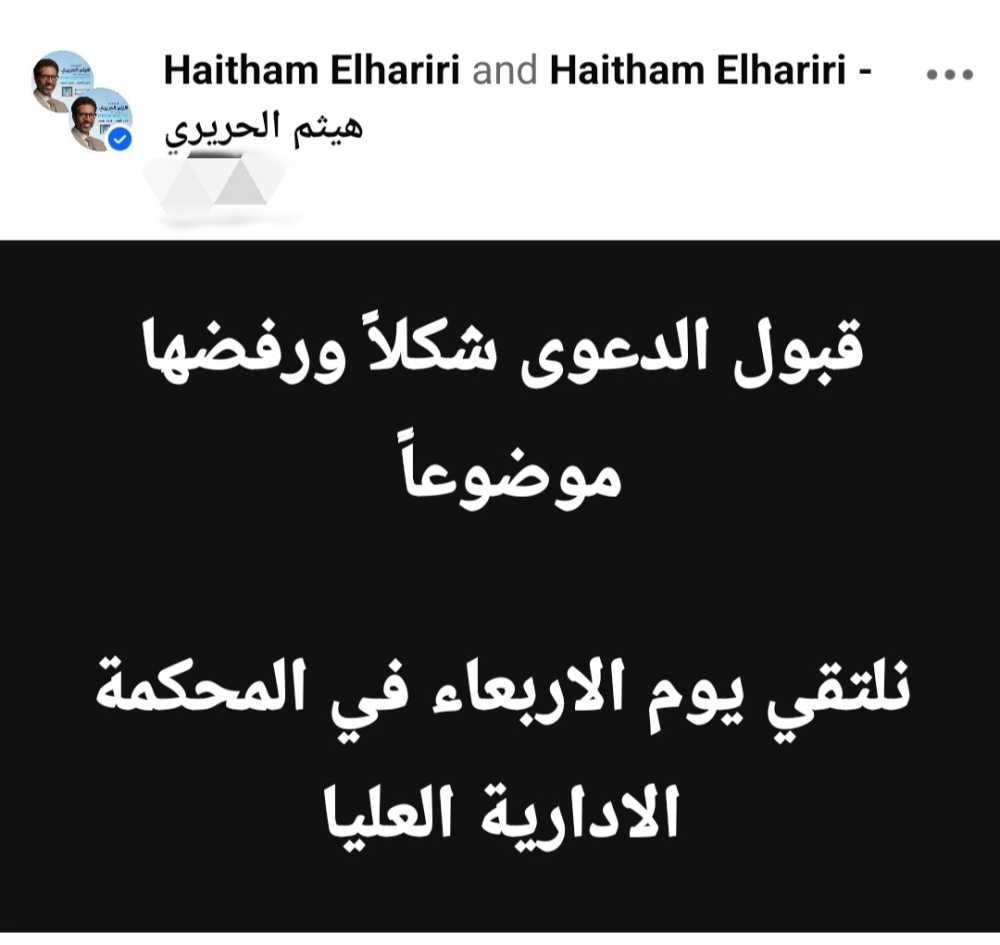 كان هيثم الحريري قد تقدم بأوراق ترشحه لمجلس النواب إلى محكمة شرق الابتدائية للترشح لانتخابات مجلس النواب 2025 (فردي) ولكنه تفاجأ بقرار استبعاده من كشوف المرشحين، ليتقدم أمس بطعن أمام مجلس الدولة ليُنظر ويصدُر الحكم اليوم.