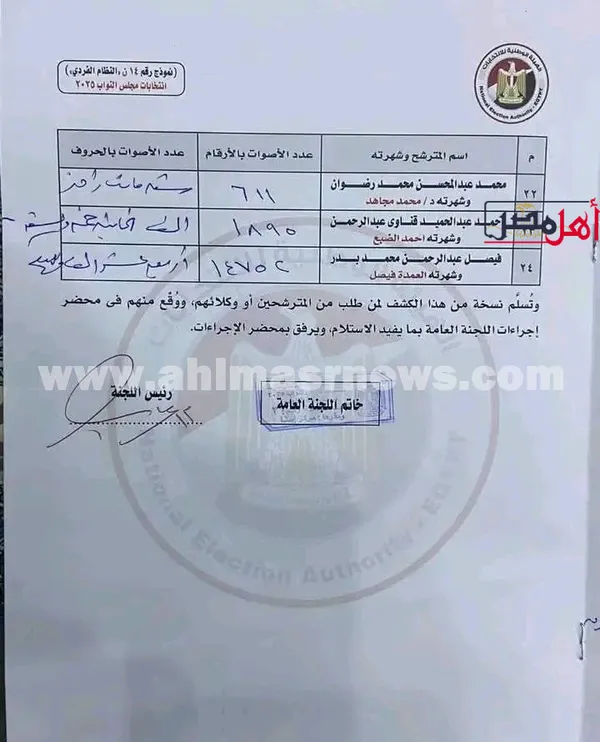 وكشفت اللجنة أن إجمالي عدد الناخبين المقيدين أمام جميع اللجان الفرعية التابعة للجنة العامة 313501 ألف صوت، وإجمالي عدد الناخبين الذين أدلوا بأصواتهم فى جميع اللجان 86826، بينما إجمالي الأصوات الباطلة فى جميع اللجان 3891 ألف صوت، وإجمالي عدد الأصوات الصحيحة في جميع اللجان 82935 ألف صوت.