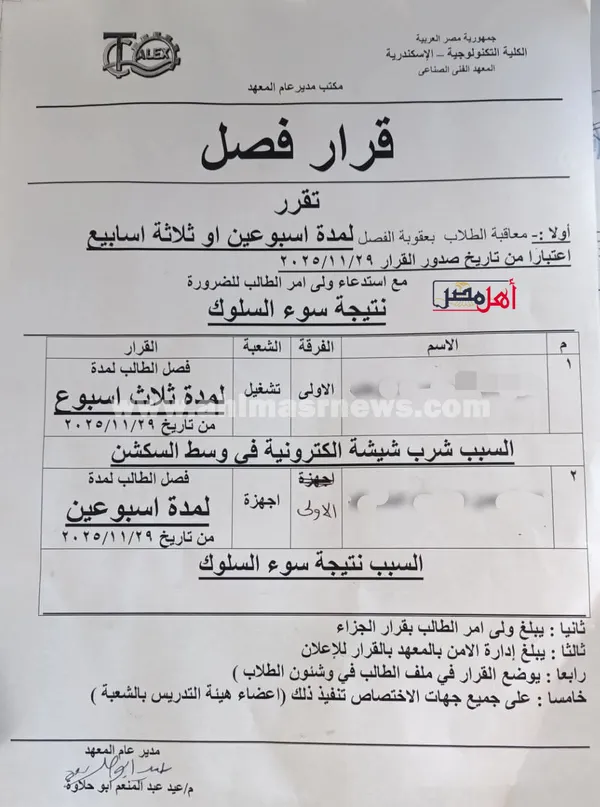 ووفقًا للقرار الصادر من المعهد الفني الصناعي بالإسكندرية، فإن الطالبين المذكورين يعتبران مفصولان من تاريخ 19 نوفمبر 2025 وللمدتين المحددتين لكل طالب على حدة.