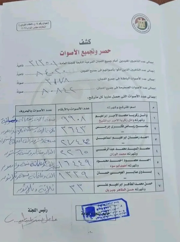 واوضحت اللجنة أن إجمالي عدد اللجان المقيدين أمام جميع اللجان الفرعية التابعة للجنة العامة 313501 صوت، وإجمالي عدد الناخبين الذين أدلوا بأصواتهم فى جميع اللجان 84020 صوتا، وإجمالي عدد الاصوات الباطلة فى جميع اللجان 3178 صوتا، وإجمالي عدد الاصوات الصحيحة في جميع اللجان 80842 صوت.