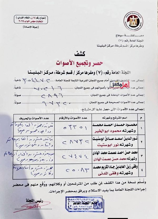 أعلنت اللجنة العامة المشرفة على انتخابات مجلس النواب بالدائرة السابعة، ومقرها مركز ومدينة البلينا جنوب محافظة سوهاج، أن الحصر العددي للأصوات أظهر تفوق الدكتور محمود حمدي أبوالخير، واللواء نور ابوستيت، وذلك وفق المؤشرات الأولية لنتائج جولة الإعادة.