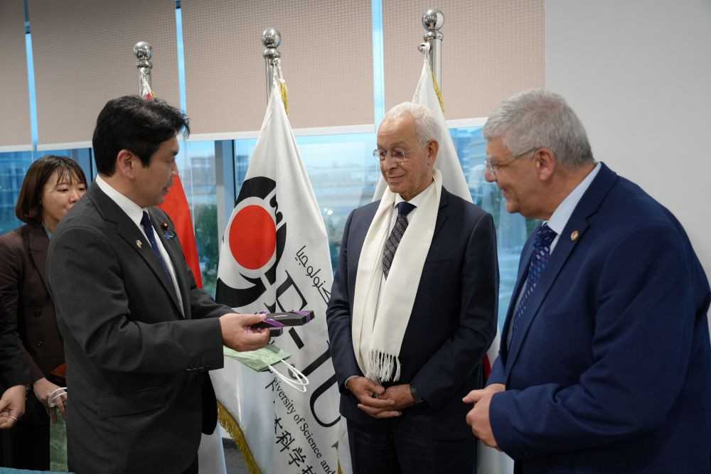 استقبلت الجامعة المصرية اليابانية للعلوم والتكنولوجيا (E-JUST)، بمقرها في القرية الذكية، ماتسوموتو يوهي، وزير التعليم والثقافة والرياضة والعلوم والتكنولوجيا الياباني، والسفير فوميو إيواي، سفير اليابان لدى جمهورية مصر العربية، أثناء زيارتهما الجماعة المصرية اليابانية.