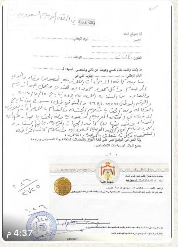 وتضمن المستند توكيلًا صادرًا عن شخص يُدعى أحمد، وهو شقيق ريان لوالده، لاستلام جثمان والده 'و.م.م'، والقيام بالإجراءات اللازمة لدفنه في المملكة العربية السعودية، والحق في إصدار شهادة وفاة، وتصديقها من كافة الجهات الرسمية، بما فيها السفارة الأردنية بالسعودية، واستلام كافة أغراضه الشخصية ومتعلقاته.