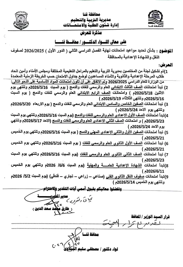 اعتمد اللواء دكتور مصطفى الببلاوي، محافظ قنا، جداول امتحانات الفصل الدراسي الثاني للعام الدراسي 2025 / 2026م، لمختلف المراحل التعليمية (النقل والشهادات العامة) على مستوى كافة الإدارات التعليمية بالمحافظة.