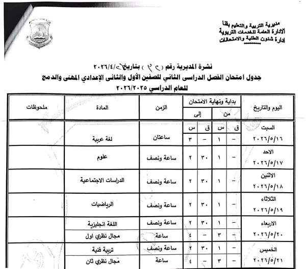 الصفين الأول والثاني الإعدادي (مهني): من السبت 16 مايو وحتى الخميس 21 مايو 2026.