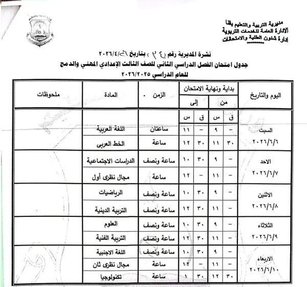 الشهادة الإعدادية (عامة ومهنية): تبدأ من السبت 6 يونيو وحتى الخميس 11 يونيو 2026.