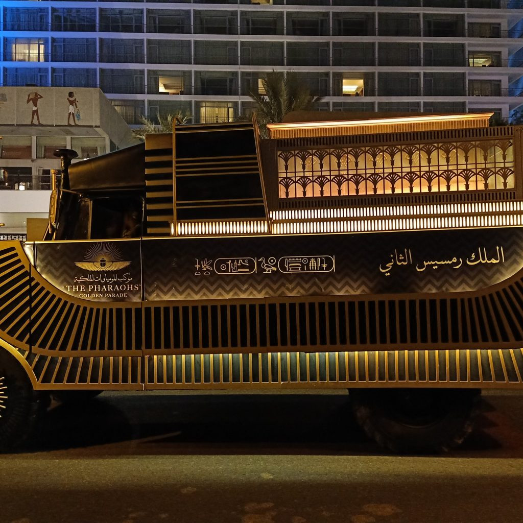 ونشرت العديد من الصفحات عبر وسائل التواصل الإجتماعى، صورا للعربات التى ستنقل المومياوات حيث يظهر على كل عربة اسم الملك أو الملكة التي ستحمله.
