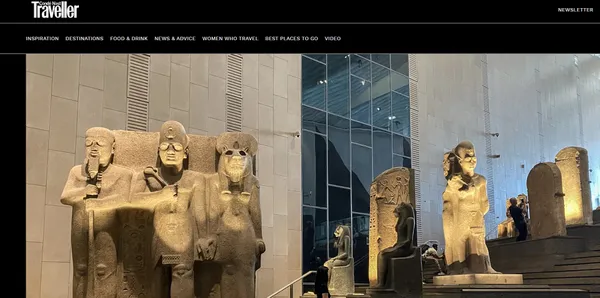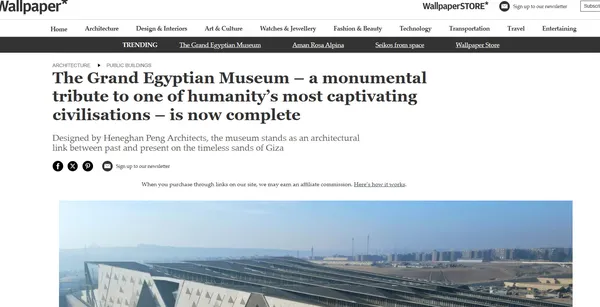 على بُعد خطوات من أهرامات الجيزة، وعلى أرض اختيرت بعناية لجعل المتحف جسرًا بين القدماء والمستقبل، يقف المبنى شاهداً على التلاقي بين العمارة المعاصرة والرمزية التاريخية، هذا ما جاء في صحيفة Wallpaper، التي أن تصميم المتحف يعكس خطوطًا تُشير إلى الأهرامات وتلميحًا إلى النيل، مع جدران واجهة تفصل بين الداخل والخارج بطريقة تجعل الزائر يشعر بأنه يدخل إلى عالم مختلف.