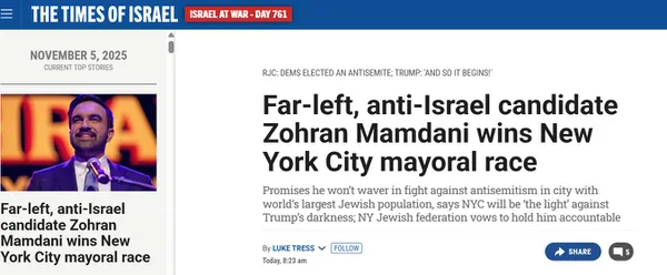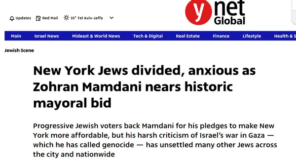 جاءت الصحيفة بعنوان:انقسام داخل يهود نيويورك مع اقتراب زهران ممداني من الفوز بمنصب العمدة
