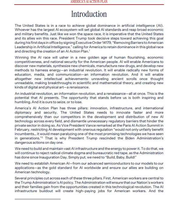 وتشمل خطة العمل الأمريكية للذكاء الاصطناعي ترتكز على ثلاثة محاور: الابتكار، والبنية التحتية، والدبلوماسية والأمن الدولي، حيث تحتاج الولايات المتحدة إلى الابتكار بشكل أسرع وأكثر شمولية من منافسيها في تطوير وتوزيع تكنولوجيا الذكاء الاصطناعي الجديدة في كل المجالات، وإزالة الحواجز التنظيمية غير الضرورية التي تعيق القطاع الخاص عن القيام بذلك، كما أشار نائب الرئيس فانز في قمة باريس للذكاء الاصطناعي في فبرايرالماضي، فإن تقييد تطوير الذكاء الاصطناعي بتنظيم صارم 'لن يفيد المنافسين فقط.. بل سيشل واحدة من أكثر التقنيات وعدًا التي شهدناها منذ أجيال'