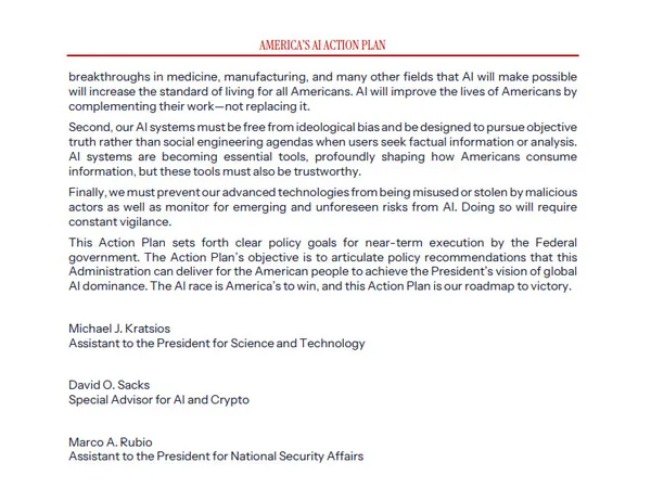 واكدت الوثيقة ان الفوز في سباق الذكاء الاصطناعي سيؤدي إلى عصر ذهبي جديد للازدهار البشري، والتنافسية الاقتصادية، والأمن القومي للأمريكيين. الذكاء الاصطناعي سيمكن الأمريكيين من اكتشاف مواد جديدة، وتصنيع أدوية جديدة، وتطوير طرق مبتكرة لاستغلال الطاقة — أي ثورة صناعية.