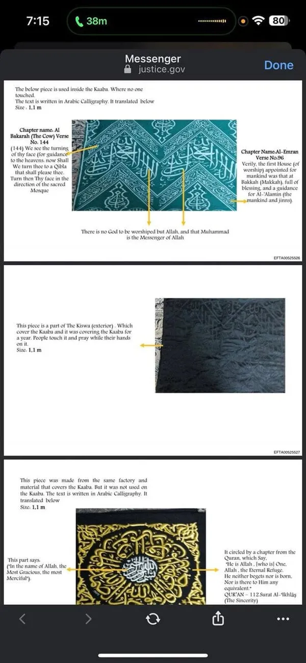 فهذه المرة، لا تتعلق التسريبات بشبكات نفوذ أو جرائم أخلاقية فحسب، بل بقطع من كسوة الكعبة المشرفة شُحنت سرًا من دولة عربية إلى الولايات المتحدة، وانتهى بها المطاف داخل منزل إبستين.