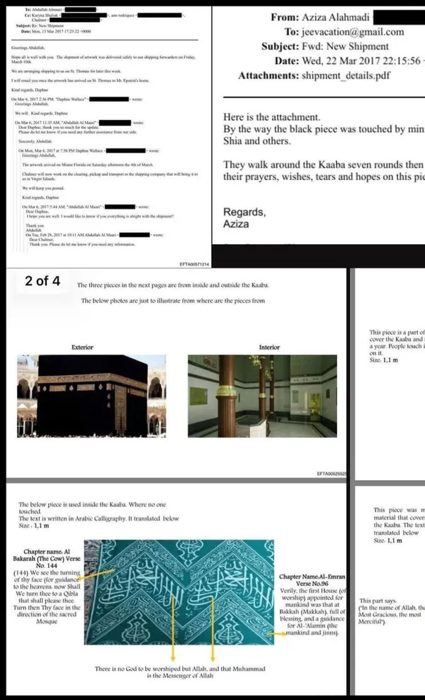 وجاء في ملفات وزارة العدل الأمريكية التي أفرج عنها مؤخرا، الكشف عن مراسلات إلكترونية في قضية جيفري إبستين، والتي تعود للفترة بين فبراير ومارس 2017، وكان موضوعها هو شحن 3 قطع وصفت بأنها من كسوة الكعبة المشرفة، لكن لاحقا تم تصنيفها كقطع أعمال فنية مؤطرة.