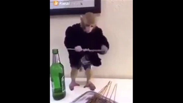 قرد يحتسي الخمر ويأكل الشواء فيفقد توازنه
