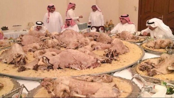 سعودي يستقبل أحد الأمراء في منزله بوليمة ضخمة على طاولة واحدة