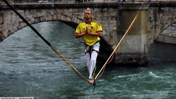 مغامر يعبر نهرًا على حبل معلق (فيديو)