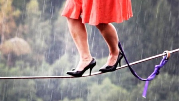 بالكعب العالي.. فتاة تستعرض مهاراتها على حبل بارتفاع 12 مترا (فيديو)