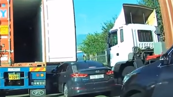 باب شاحنة يصطدم بسيارة متوقفة خلال حركة السير (فيديو)