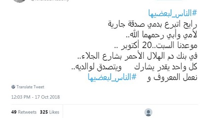 وكتب النبوي:" رايح اتبرع بدمي صدقة جارية، لأمي وأبي رحمهما الله.. موعدنا السبت..20 أكتوبر .. في بنك دم الهلال الأحمر بشارع الجلاء..كل واحد يقدر يشارك ويتصدق لوالديه.. نعمل المعروف و الناس لبعضيها".