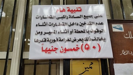 ظهرت لافتات تنبيه بالمحطات التابعة لسكك حديد مصر تحذر من تعرض راكبي القطارات من الغرامة المالية لمدخنى السجائر بالقطارات ولم يقتصر القرار على العربات المكيفه فقط بل شمل العربات المميزة على جميع الخطوط الطولية والعربات المطورة الخاصة بخطوط المناشي والضواحي.