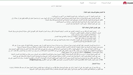 - خلال فترة الضمان ستقوم شركة هواوي أو مركز الصيانة المعتمد بإصلاح الجهاز أو إستبدال أجزاء منه إذا كان الجهاز معيب, لن يتم تحميل العميل بأي تكاليف (قطع غيار أو عمالة أو أي تكاليف أخري) لإصلاح الجهاز خلال فترة الضمان, جميع قطع الغيار المستخدمة في الإصلاح تصبح ملك لمركز الصيانة.