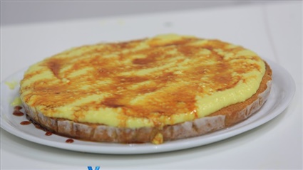 - نقلب البسبوسة في طبق التقديم و نملئ الفراغ بالكراميل.