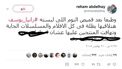 كتب أحد مستخدمي "تويتر" تعليقا بعد فستان رانيا يوسف التي ارتدته، قائلا: "وطبعا بعد قميص النوم اللى لبسته رانيا يوسف هنلاقيها بطلة فى كل الأفلام والمسلسلات الجاية وتهافت المنتجين عليها".