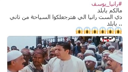 وسخر آخر، ونشر صورة من فيلم "محامي خلع" للفنان هاني رمزي، وكتب: " ما لكم يا بلد؟ دي الست رانيا اللي هترجعلكوا السياحة من تاني .. يا بلد".