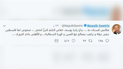 علق نجيب ساويرس على فستان رانيا يوسف قائلاً :"مكانش فستان ده .. بتاع رانيا يوسف خلاص التايم لاينً اتحجز .. صحونى لما فلسطين تبقى دولة و ترامب يتصالح مع الصين و كوريا الشمالية... و الأهلى ياخد الدورى".