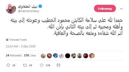 حرص الفنان نبيل الحلفاوي على تهنئة الكابتن محمود الخطيب رئيس النادي الأهلي، عقب عودته لمنزله من ألمانيا، إذ كان يُجري عملية جراحية لاستئصال ورم في الرقبة يضغط على الحبل الشوكي، وكتب الحلفاوي عبر حسابه على موقع "تويتر": "حمدا لله على سلامة الكابتن محمود الخطيب وعودته إلى بيته وأهله ومحبيه ثم إلى بيته الثاني بإذن الله، أتم الله شفاءه ومتعه بالصحة والعافية".