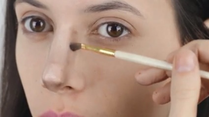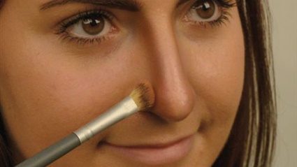 6- ارسمي خط باستخدام كنتور بفرشاة رفيعة، ولها زاوية على أن تكون نظيفة، والبدء من زوايا العين الداخلية وصولا إلى حافة الأنف فقط، وفي حال الرغبة بترفيع فتحات الأنف العريضة عندها يجب تطبيق الظل.