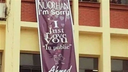 وفي جامعة عين شمس، علق طالب لافتة علي جدران كلية الحقوق، يعتذر فيها لمحبوبته باللغة الانجليزية، وحملت اللافتة: " marry me.. nourhan im sorry I just love you in public""، الأمر الذي لاقي استحسان طلاب الكلية، وقاموا بالتصفيق الحاد للطالب، فيما قابلت الطالبة الموقف بالخجل والابتسامة بعد احمرار وجهها.