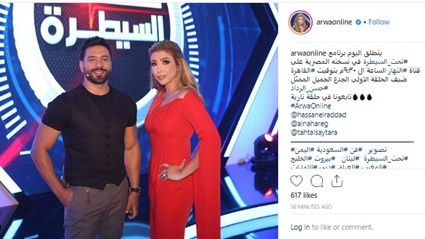 ونشرت أروى صورة من كواليس الحلقة وكتبت: "ينطلق اليوم برنامج تحت السيطرة في نسخته المصرية على قناة النهار الساعة الـ ٩:٣٠م بتوقيت القاهرة ضيف الحلقة الأولى الجدع الجميل الممثل حسن الرداد، تابعونا في حلقة نارية".