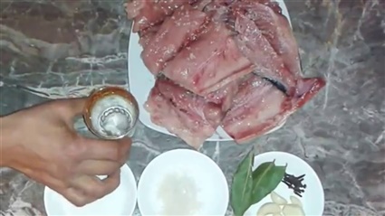 ثم نضيف ورق اللورا والفلفل الأسود والكمون وشرائح الليمون، ونترك الماء يغلي لمدة دقيقتين، ونضيف السمك ونتركه حتى يغلي، ثم نغطي الوعاء، ونتركه على نار هادئة جدًا لمدة 60 دقيقة، نقوم برفع السمك من ماء السلق، ثم نضعه فورًا في ماء مثلج، ونتركه لمدة دقيقتين.