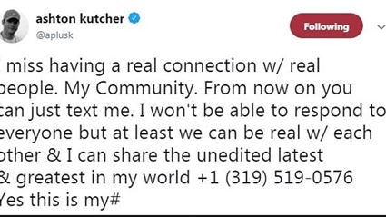 وبدأ كوتشر (40 عاما) تغريدته قائلا: "أفتقد وجود علاقة حقيقية مع أناس حقيقيين، مجتمعي" وتابع كوتشر: "من الآن فصاعدا يمكنك إرسال رسالة نصية، لن أتمكن من الرد على الجميع ولكن على الأقل يمكننا أن نكون حقيقين مع بعضنا البعض ويمكنني مشاركة أحدث وأعظم التطورات في عالمي" وكتب رقمه، كما تضمنت التغريدة أيضًا صورة متحركة له ، تقول: "أنت جزء مما نحن عليه ، ونحن نحبك"