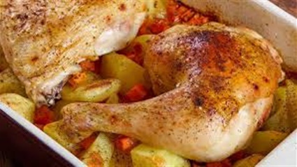 ثم نضع البطاطس والدجاج في صينية الفرن مع كوب المرق، ونضيف إليهم الملح والفلفل، ثم توضع الصينية في الفرن لمدة نص ساعة تقريبا، أو حتى نتأكد من تسويتها جيدا، من الممكن أن نضع زيت الزيتون على وجه الصينية عند التقديم.