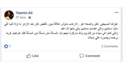 وجهت الفنانة الشابة ياسمين علي رسالة إلى المسيحين بعد حادث انفجار الازهر الإرهابي الذي نال منطقة الأزهر أمس الاثنين 18 فبراير، وكتبت: "إخواتنا المسيحيين.. أظن واضحة آهو.. الإرهاب ما لوش علاقة بدين.. التفجير كان عند الأزهر ده أولا، ثانيا اللي ماتوا مسلمين واللي اتصاب مسلمين وفيه منهم الله أعلم".
