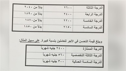 وذكر البيان ان قيمة التحسن في الاجر للعاملين بالدولة يبلغ علي سبيل المثال في الدرجة الممتازة 2400 جنيها شهريا، والثالثة التخصصية 560 جنيها شهريا والسادسة العمالية 300 جنيها شهريا.