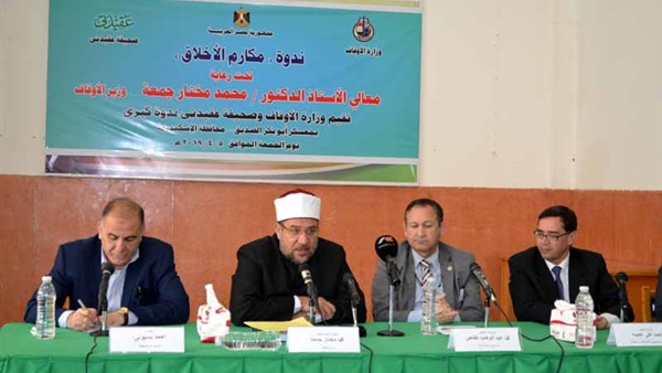 عقدت اليوم وزارة الأوقاف ندوة تحت عنوان “مكارم الأخلاق” ، وذلك ضمن فعاليات الدورة التثقيفية الثامنة للسادة الأئمة المتميزين المشاركين في معسكر أبي بكر الصديق بالإسكندرية , حاضر فيها كل من: الدكتور محمد مختار جمعة وزير الأوقاف , وأحمد علي عجيبة الأمين العام للمجلس الأعلى للشئون الإسلامية , واللواء أحمد بسيوني سكرتير عام المحافظة , والمستشار محمد خفاجي نائب رئيس مجلس الدولة , وبحضور قيادات الدعوة بالإسكندرية ، والأئمة المشاركين بالمعسكر .