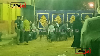 مدخل المنزل لم يخلُ من الباكيات الصارخات طوال اليوم، الذي سيطر أرجاء المكان، يجاورهم سرادق للعزاء، لم يتسع الأهالي، يعلو فوق رؤوسهم صورة الشهيد، يصطحبها أية قرآنية «يَا أَيَّتُهَا النَّفْسُ الْمُطْمَئِنَّةَ * ارْجِعِي إِلَى رَبِّكِ رَاضِيَةً مَرْضِيَّةً».