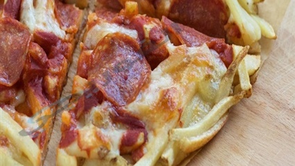 ضعي البطاطس المقلية في صينية الفرن، ووزعي صلصة البيتزا فوق شرائح البطاطس.