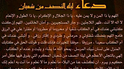 “اللَّهُمَّ يَا ذَا الْمَنِّ وَلَا يُمَنُّ عَلَيْهِ، يَا ذَا الْجَلَالِ وَالإِكْرَامِ، يَا ذَا الطَّوْلِ وَالإِنْعَامِ. لَا إِلَهَ إِلَّا أَنْتَ ظَهْرَ اللَّاجِئينَ، وَجَارَ الْمُسْتَجِيرِينَ، وَأَمَانَ الْخَائِفِينَ. اللَّهُمَّ إِنْ كُنْتَ كَتَبْتَنِي عِنْدَكَ فِي أُمِّ الْكِتَابِ شَقِيًّا أَوْ مَحْرُومًا أَوْ مَطْرُودًا أَوْ مُقَتَّرًا عَلَيَّ في الرِّزْقِ، فَامْحُ اللَّهُمَّ بِفَضْلِكَ شَقَاوَتِي وَحِرْمَانِي وَطَرْدِي وَإِقْتَارَ رِزْقِي، وَأَثْبِتْنِي عِنْدَكَ فِي أُمِّ الْكِتَابِ سَعِيدًا مَرْزُوقًا مُوَفَّقًا لِلْخَيْرَاتِ، فَإِنَّكَ قُلْتَ وَقَوْلُكَ الْحَقُّ فِي كِتَابِكَ الْمُنَزَّلِ عَلَى لِسَانِ نَبِيِّكَ الْمُرْسَلِ: ﴿يَمْحُو اللهُ مَا يَشَاءُ وَيُثْبِتُ وَعِنْدَهُ أُمُّ الْكِتَابِ﴾، إِلهِي بِالتَّجَلِّي الْأَعْظَمِ فِي لَيْلَةِ النِّصْفِ مِنْ شَهْرِ شَعْبَانَ الْمُكَرَّمِ، الَّتِي يُفْرَقُ فِيهَا كُلُّ أَمْرٍ حَكِيمٍ وَيُبْرَمُ، أَنْ تَكْشِفَ عَنَّا مِنَ الْبَلَاءِ مَا نَعْلَمُ وَمَا لَا نَعْلَمُ وَمَا أَنْتَ بِهِ أَعْلَمُ، إِنَّكَ أَنْتَ الْأَعَزُّ الْأَكْرَمُ. وَصَلَّى اللهُ عَلَى سَيِّدِنَا مُحَمَّدٍ النَّبِيِّ الأُمِّيِّ وَعَلَى آلِهِ وَصَحْبِهِ وَسَلَّمَ”.