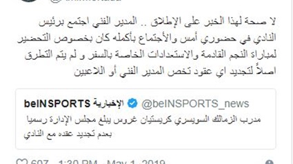 وغرد أمير عبر حسابه الرسمي على "تويتر":"لا صحة لهذا الخبر على الإطلاق .. المدير الفني اجتمع برئيس النادي في حضوري أمس والأجتماع بأكمله كان بخصوص التحضير لمباراة النجم القادمة والاستعدادات الخاصة بالسفر و لم يتم التطرق اصلاً لتجديد اي عقود تخص المدير الفني أو اللاعبين".