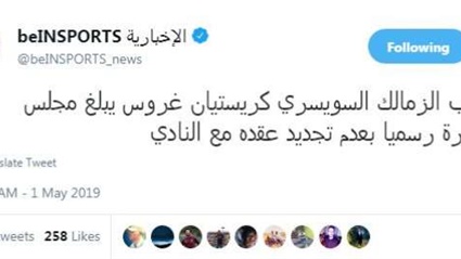 وكشف الحساب الرسمي لقناة بي إن سبورت الإخبارية، على توتير، أن جروس سيرحل عن الزمالك، بعد أن رفض تجديد عقده:" مدرب الزمالك السويسري كريستيان غروس يبلغ مجلس الإدارة رسميا بعدم تجديد عقده مع النادي".