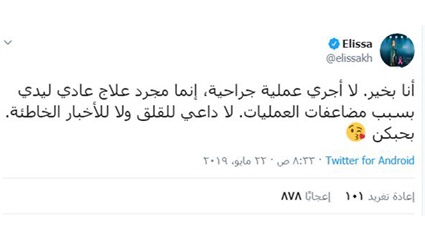 وكتبت إليسا عبر حسابها الشخصي بموقع التواصل الإجتماعي "تويتر": "أنا بخير. لا أجري عملية جراحية، إنما مجرد علاج عادي ليدي بسبب مضاعفات العمليات. لا داعي للقلق ولا للأخبار الخاطئة. بحبكن".
