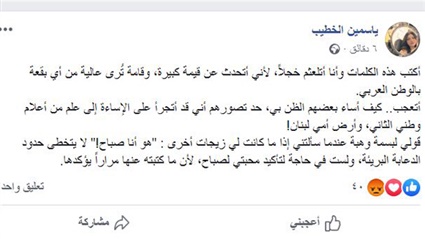 وكتبت ياسمين الخطيب عبر صفحتها الشخصية بموقع التواصل الاجتماعي «فيس بوك»: "أكتب هذه الكلمات وأنا أتلعثم خجلاً، لأني أتحدث عن قيمة كبيرة، وقامة تُرى عالية من أي بقعة بالوطن العربي، أتعجب.. كيف أساء بعضهم الظن بي، حد تصورهم أني قد أتجرأ على الإساءة إلى علم من أعلام وطني الثاني، وأرض أمي لبنان!".